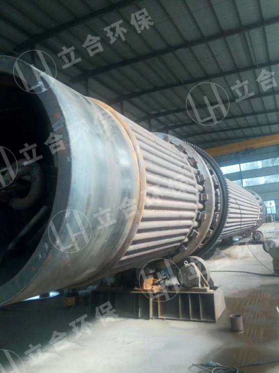 二、设备结构、滚筒列管式干燥机主要由筒体、内加热管束、外加热列管、滚圈、托轮、挡轮、传动机构、高温球阀等部分组成,在其内、外加热管中通过80℃-300℃加热介质,主体略带倾斜并能回转。